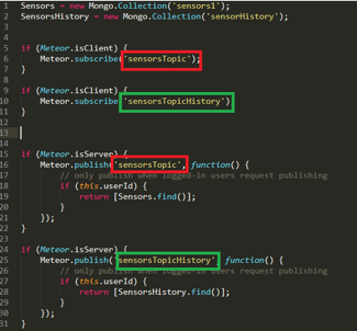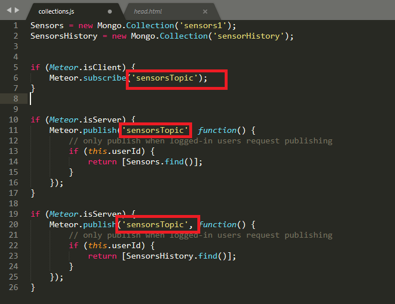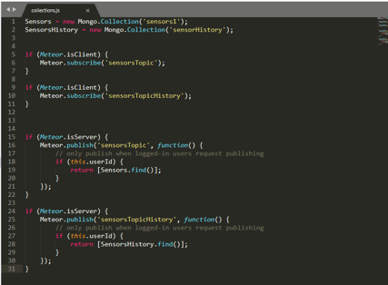 collections/collections.js – Sensor data collection, data subscription and data publishing.