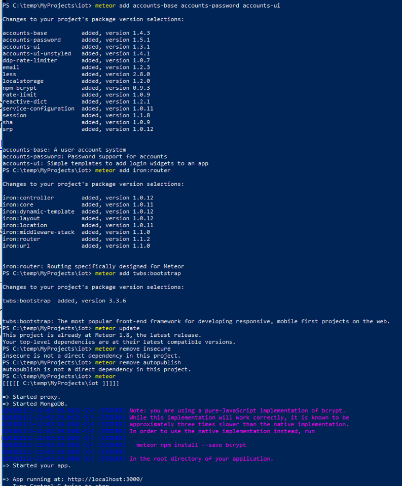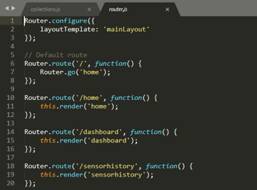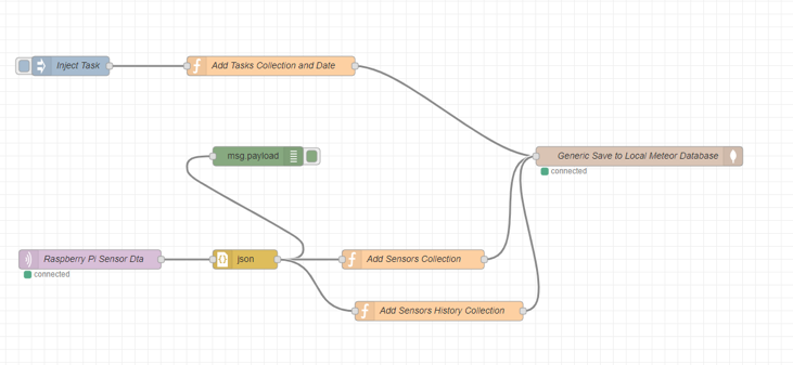 meteor remove kadira:flow-router kadira:blaze-layout static-html react-meteor-datameteor npm remove react react-dommeteor add blaze-html-templates reactive-dict - you'll see these added to your .meteor/packagesmeteor remove autopublish per the instructions from the tutorialreact_tutorial_codemeteor reset and then meteor was working fineAt the end, you need to add a new collection like sensorhistory in addition to the sensor collection. As such, you need to add another collection called sensorhistory and also edit your nodered flow. You can add a second function to add the timestamp collection in the collections.js file within the IoT app to include a new collection as well as define a new side nav for a separate dashboard in the single MongoDB.
